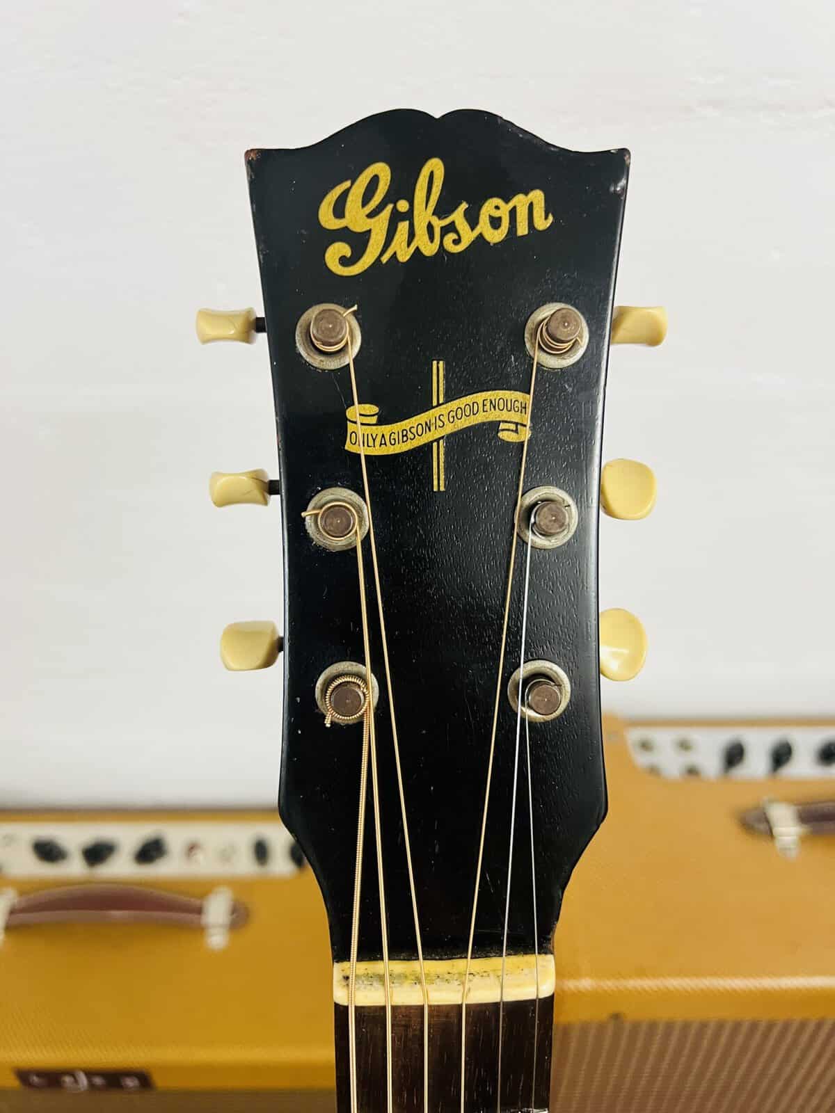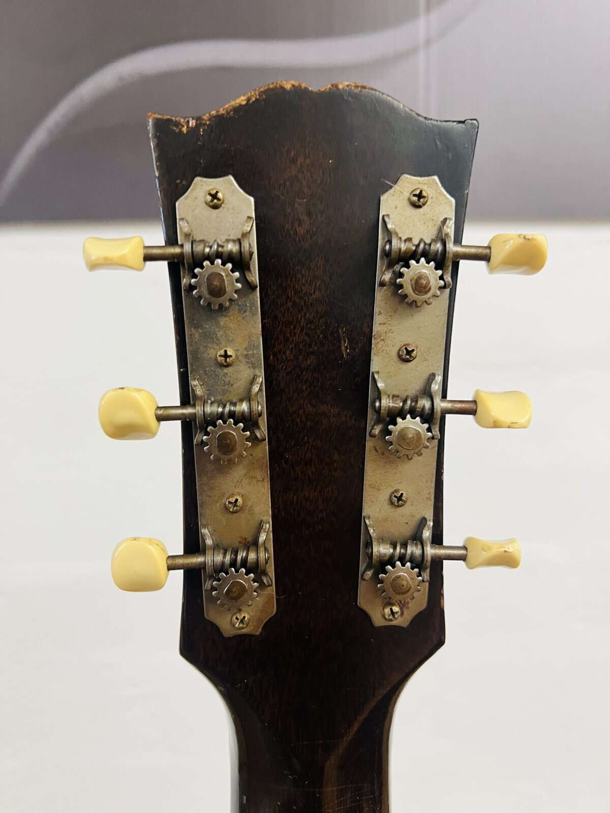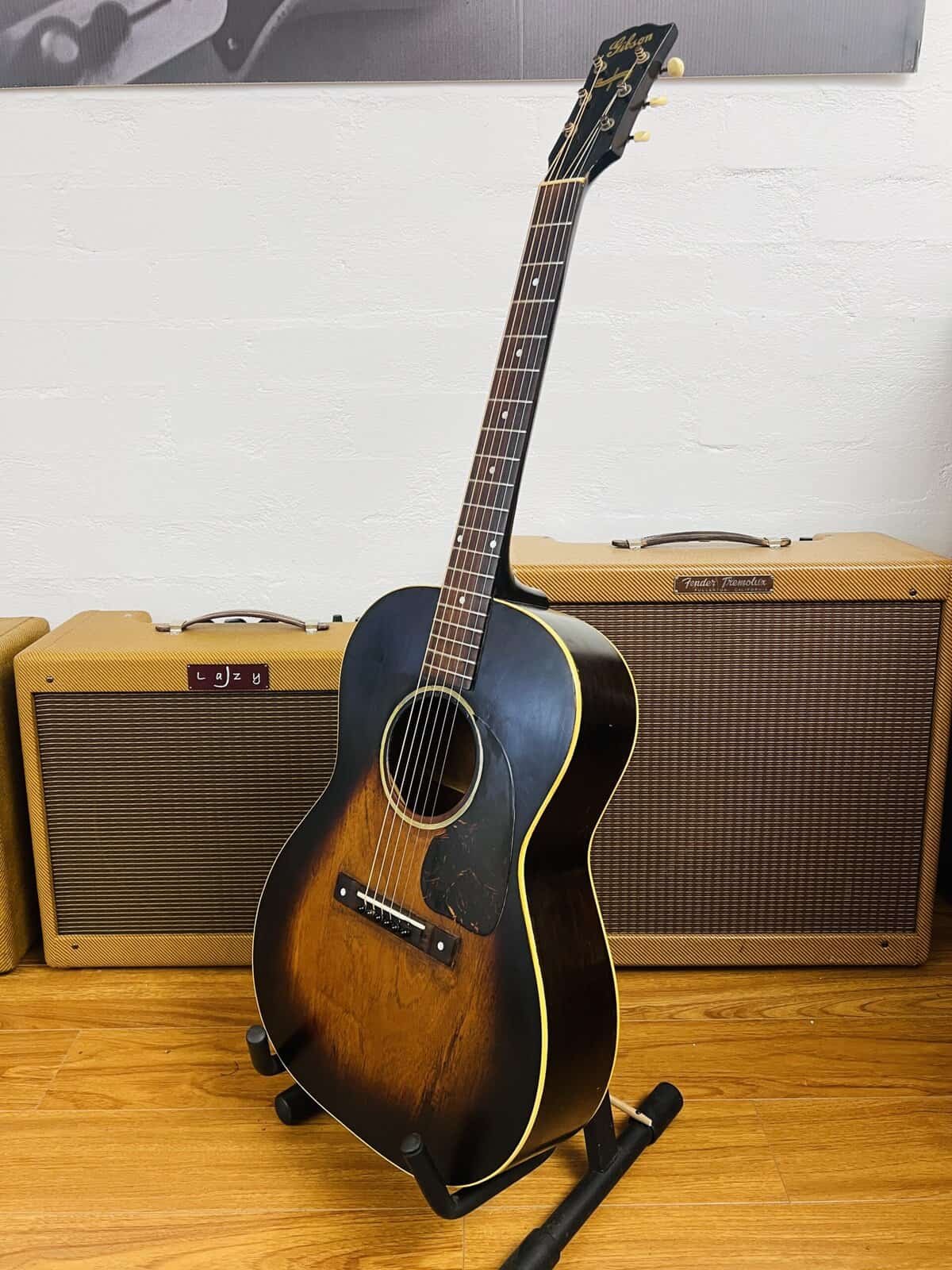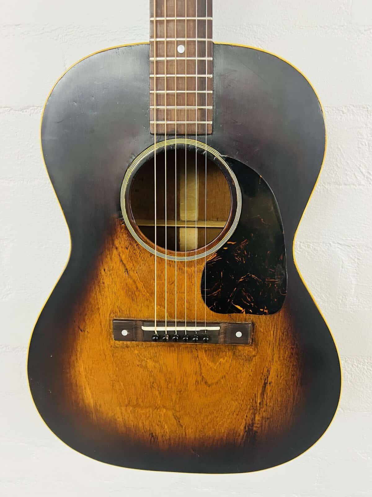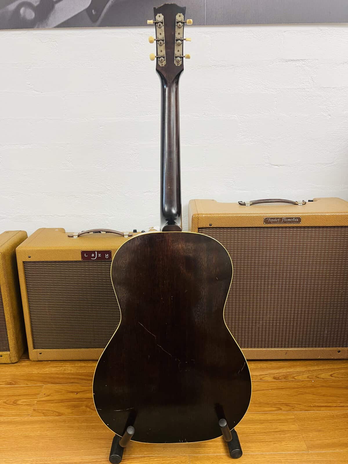 Introduced in 1942, Gibson’s LG2 features an X-braced top with 14-1/8” body width, 4-1/4” body depth, and Gibson’s standard 24-3/4” scale length. In 1943, during the WW2 years, some LG2s were made with Mahogany rather than Spruce tops, some with Maple back and sides and some – including this example – with a one-piece Mahogany top, plus Mahogany back and sides. The top on this guitar has been repaired and refinished in traditional Gibson ‘Cremona’ two-tone burst. We believe the rectangular bridge is original, as it is a style sometimes seen on other 1940s LGs. The neck features a 1-3/4” nut width and the neck profile is a full D shape. The frets appear to be original, dressed and polished down to 60% height but playing well. The headstock, logo and original rivetted 3-on-a-plate Kluson tuners are all present and correct, with the original plastic tuner buttons functional and showing minimal shrinkage. The one-piece Mahogany top gives this guitar a very noticeable responsiveness, volume and sustain, unique among LGs that we have so far had the pleasure of playing. This light-weight, marvellous-sounding and rare ‘Banner LG2’ comes with a good quality Martin 00-size hardcase.