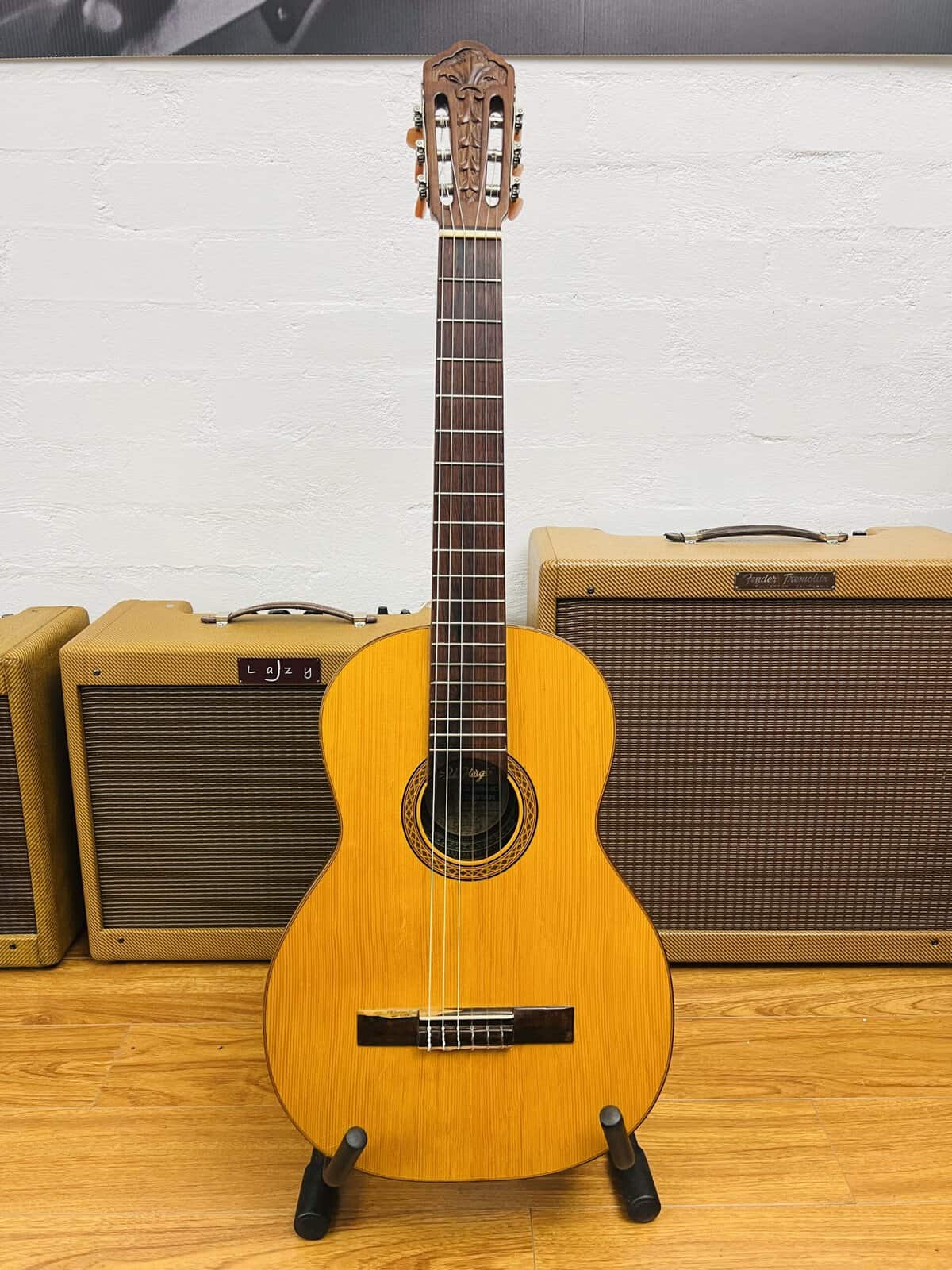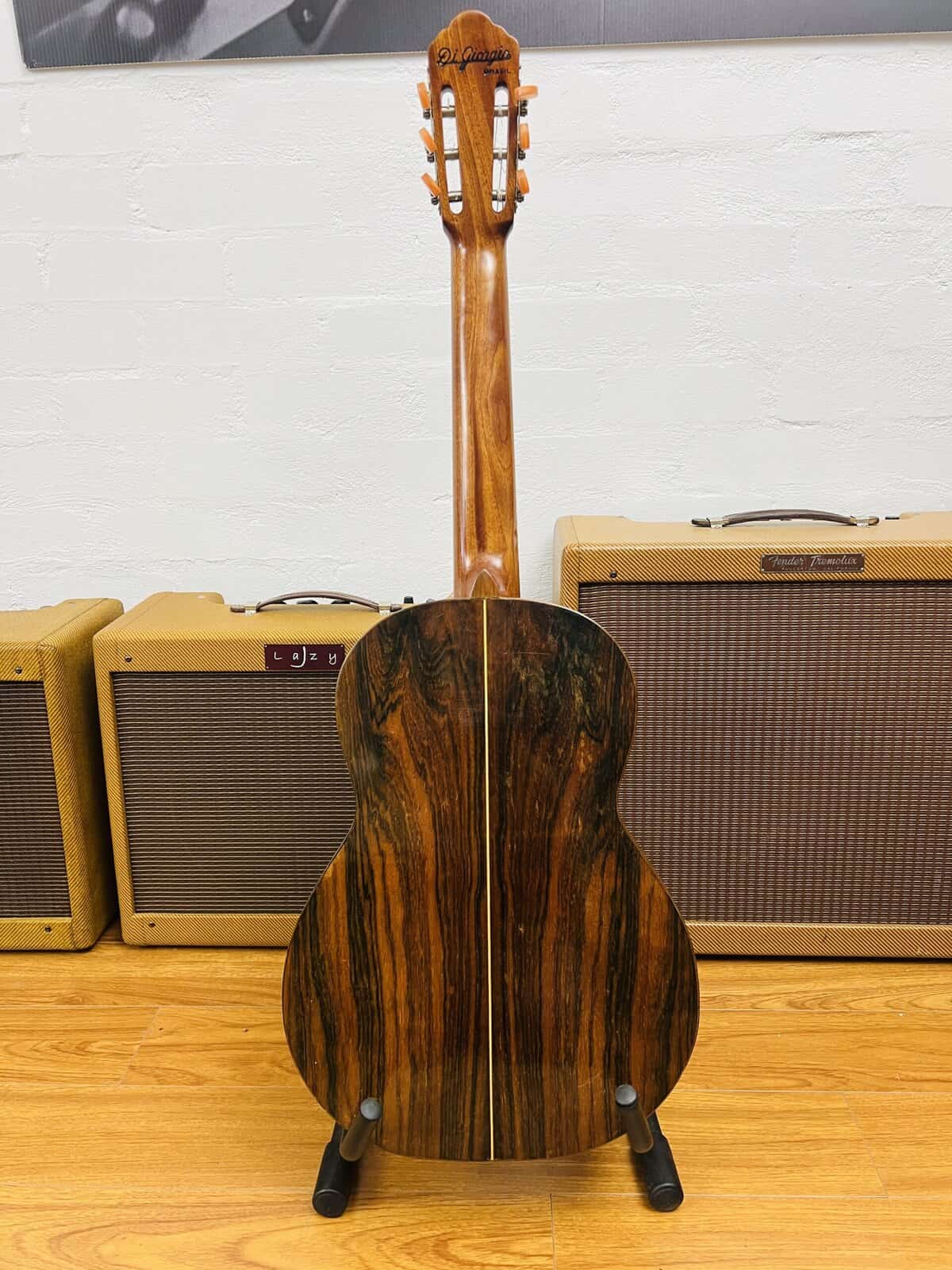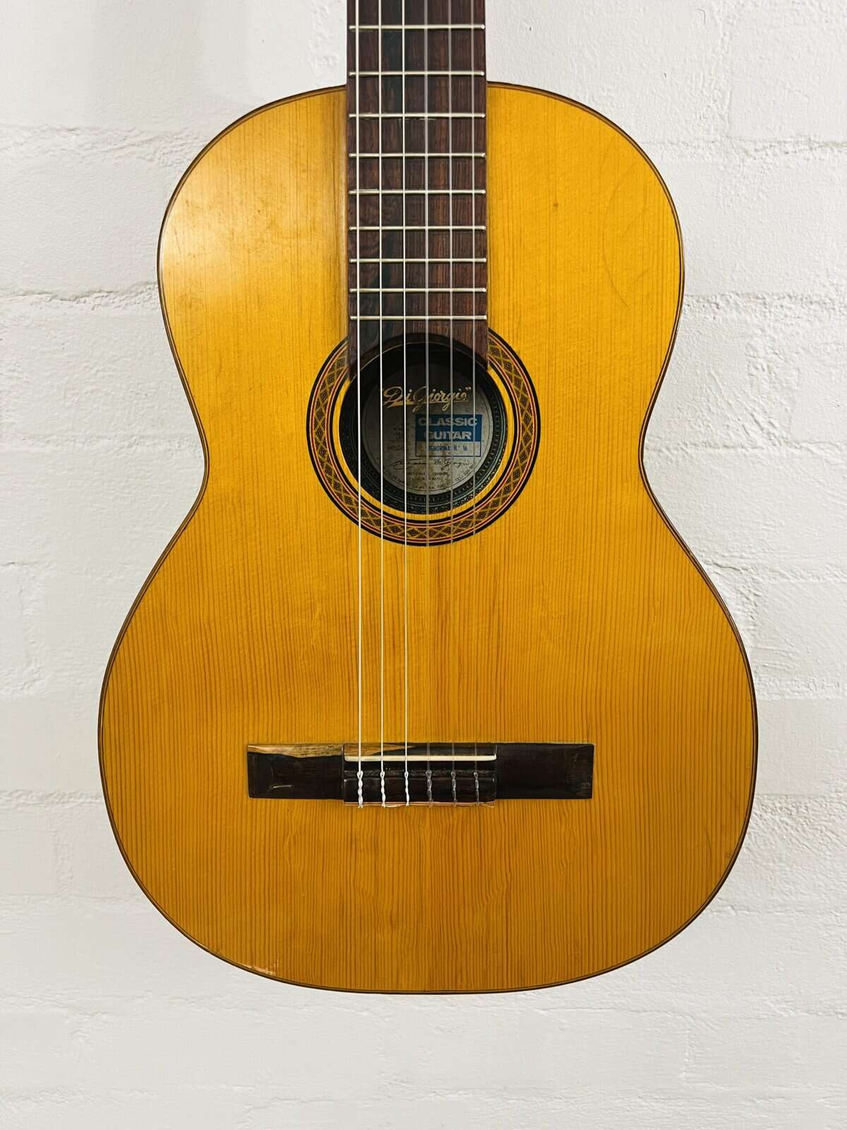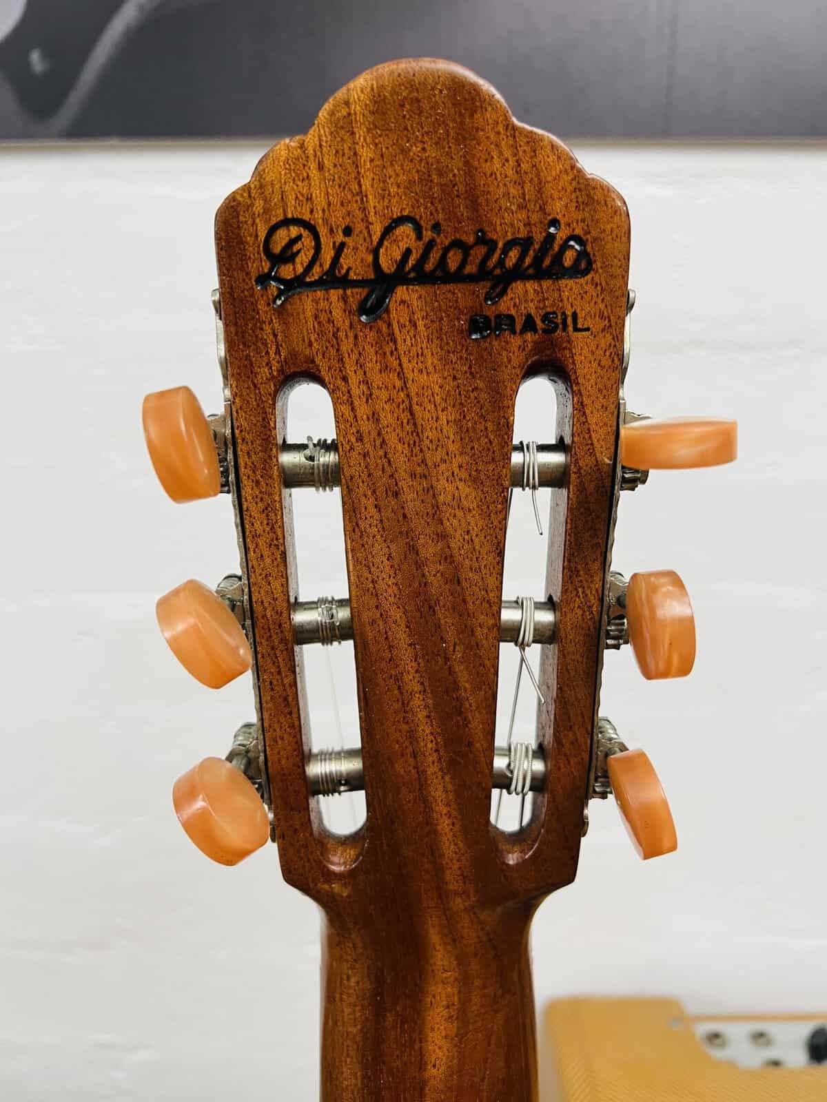 1972 DiGiorgio Brazilian “Ladies” Guitar Signorina No16 – Sau Paulo Brazil. This Brazilian master piece is a rare find Signorina model. The Di Giorgio features a flat spruce top, round soundhole, bound body, Brazilian Rosewood back/sides and Carved peghead. There is a mahogany and maple stringer strip down the back and the peghead has a beautiful carved leaf design. The tuning buttons are of a peach/cream pearloid. The back of the head has “Di Giorgio Brasil” engraved by the artist. There is a rosette around the sound hole and wood binding around the body to strengthen them. There are a no cracks and the sound is loud and pure.This is a handcrafted, beautiful sounding classical guitar. It is in extremely fine condition.