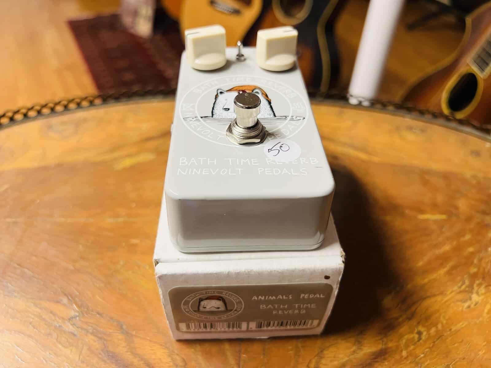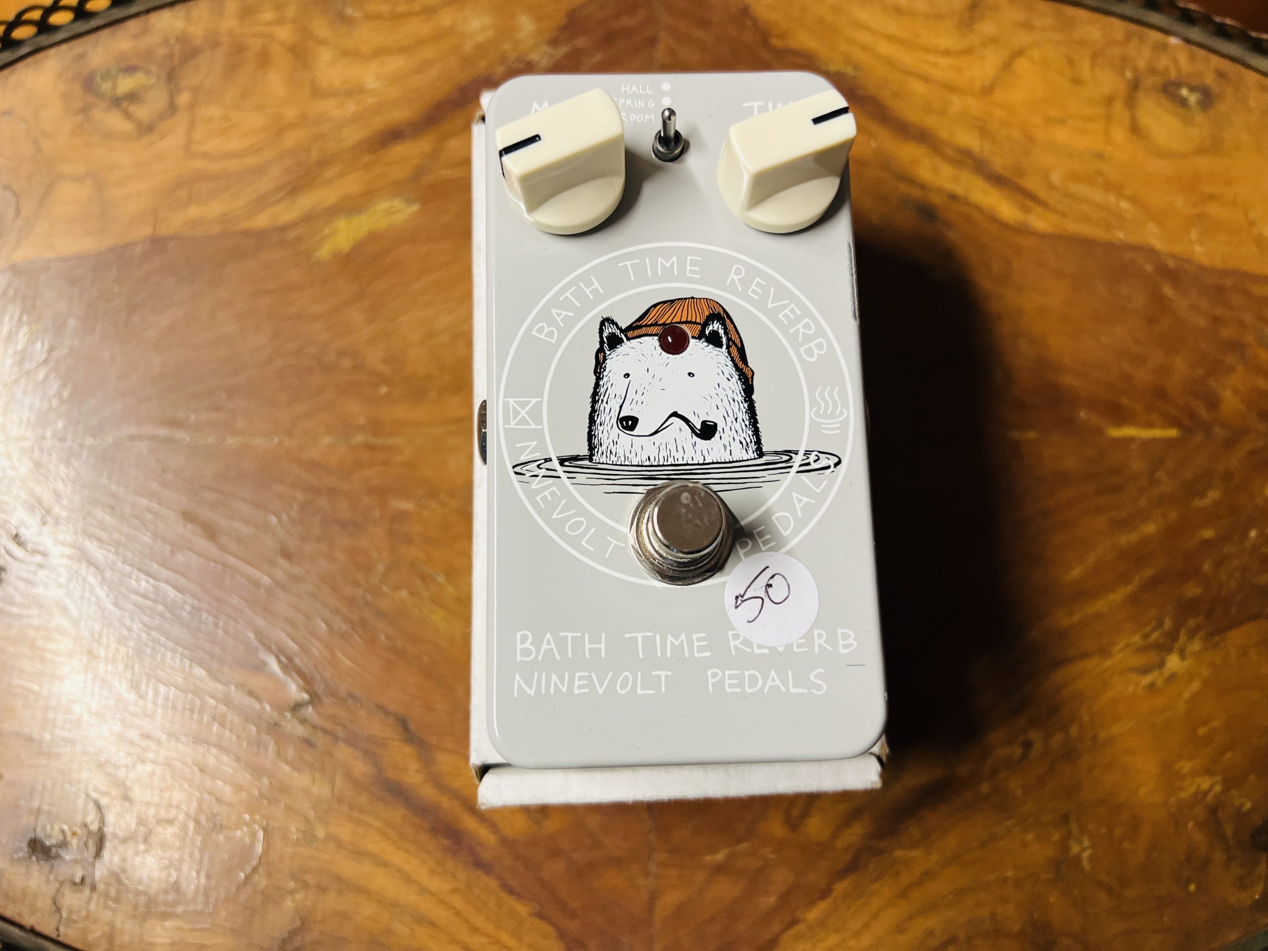 The Bathtime Reverb is a simple guitar pedal that offers three distinct reverb types: spring, hall, and room. It features a Mix control for blending the effect with your dry signal, a Time control for the decay length, and a three-way toggle switch for selecting the reverb type. The pedal can be powered by a 9V battery or adapter and is known for its straightforward operation and unique, art-style design.
