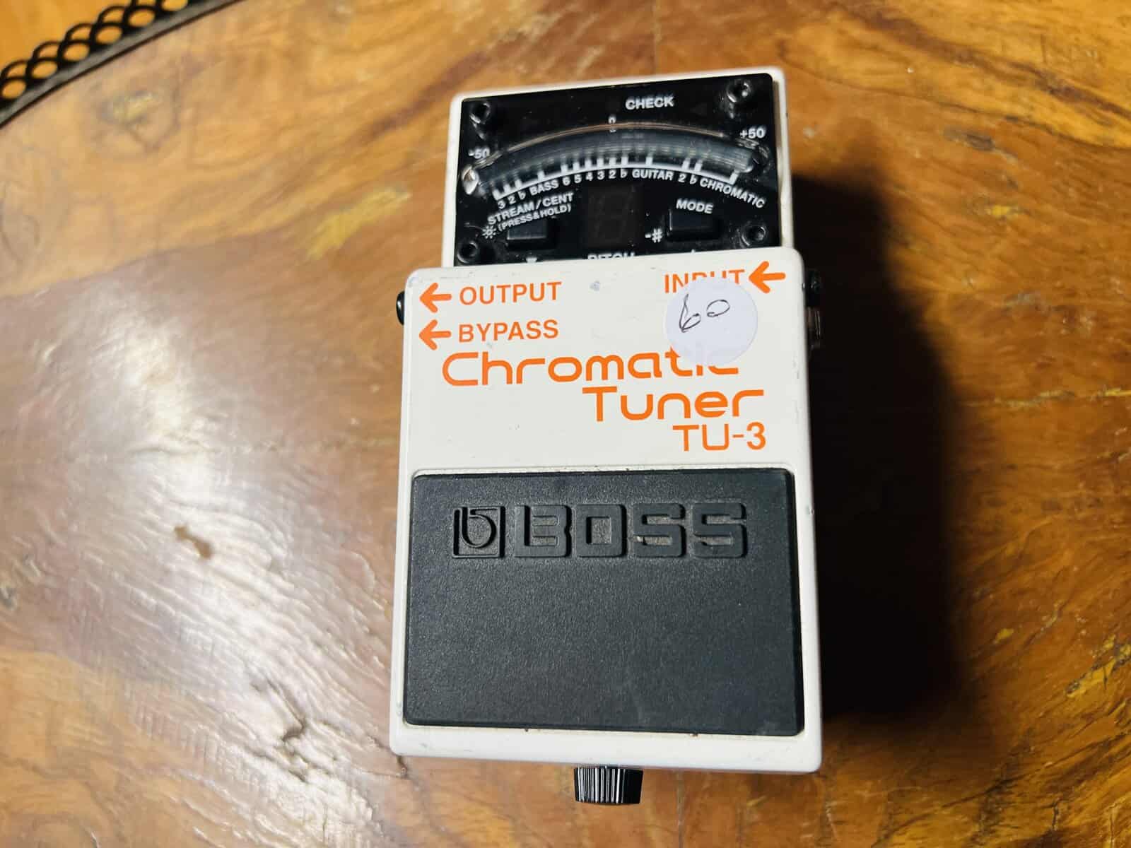 The Boss TU-3 is a durable chromatic tuner stompbox that features a 21-segment LED meter with a high-brightness mode, Accu-Pitch Sign for visual confirmation, and multiple tuning modes including chromatic and guitar/bass with support for extended-range instruments and drop tunings. It also includes a mute function, a buffered output, and can power other pedals.