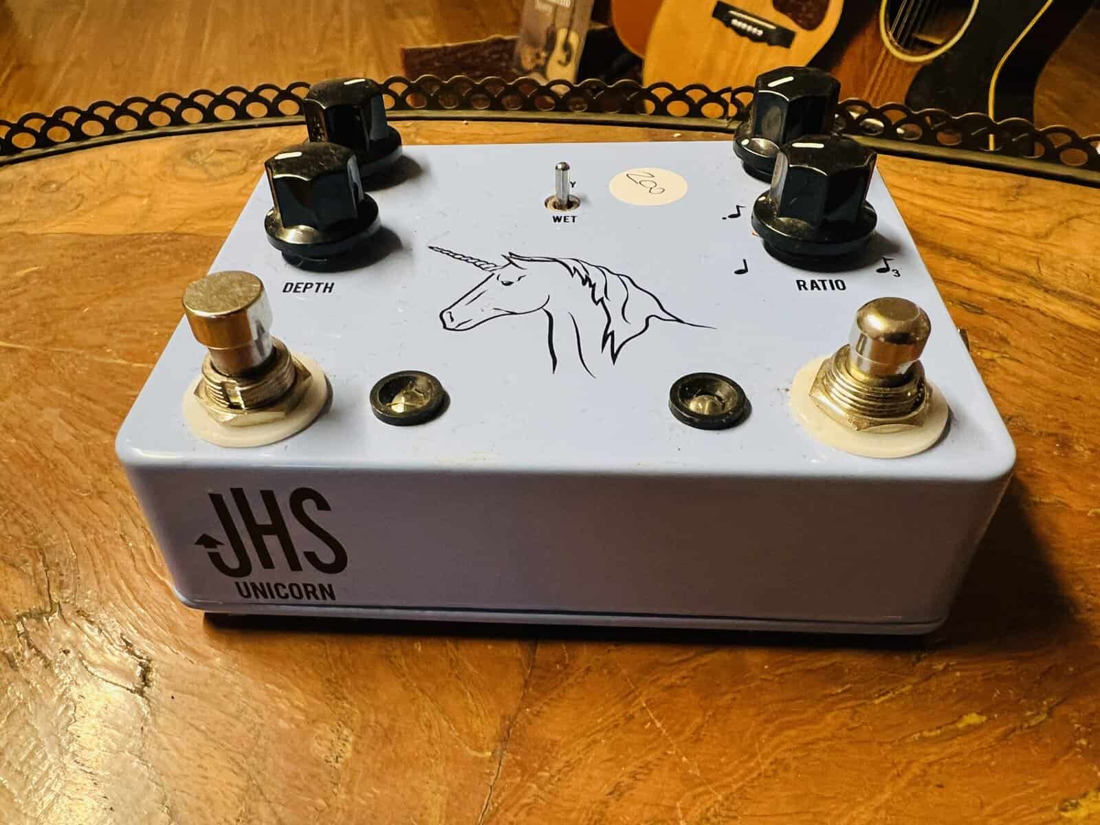 The JHS Unicorn is a guitar effects pedal that recreates the classic, swirling analog Uni-Vibe sound, adding modern features like tap tempo control, external expression pedal input, and ratio subdivisions. It is a photocell-based modulation pedal with controls for volume, depth, and speed, and a toggle for choosing between a “Chorus” mode (a blend of dry and wet signals) and a “Vibrato” mode (a 100% wet, pitch-bending effect).